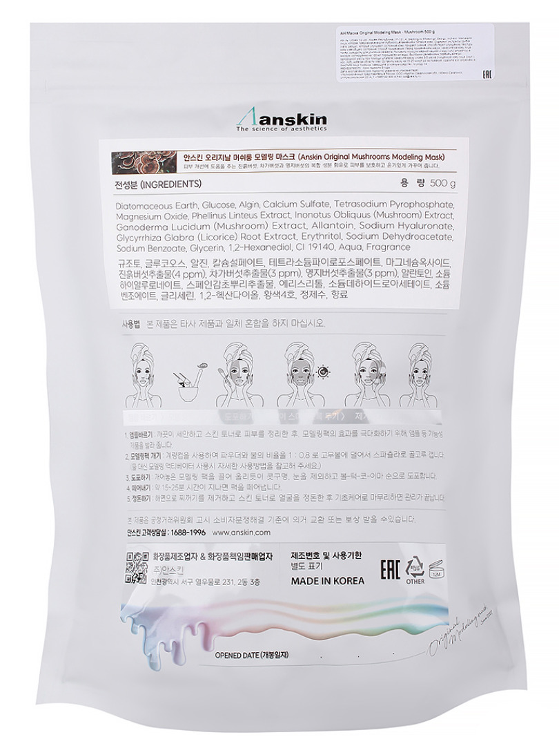 Изг-ль: LIGIAN Co.Ltd., Корея, Республика, 1F-101, 4, Gajeong-ro 37beon-gil, Seo-gu, Incheon. Маска предназначена для глубокого увлажнения и питания кожи. Содержит экстракты грибов (чага, рейши), которые улучшают состояние кожи, придают сияние, способствуют улучшению текстуры кожи. Способ применения: Перед применением маски, нанесите на кожу лица тонер, сыворотку для усиления эффекта. Положить порошок мерной чашкой и воду (или активатор) в миску в соотношении на 100 мл порошка 80 мл воды, быстрыми движениями перемешайте до однородной массы при помощи шпателя, нанесите маску слоем 3-5 мм на очищенную кожу лица (скулы, нос, лоб), избегая области глаз. Оставить маску на 15-25 минут до застывания. Удалите все загрязнения, очистите лицо тонером, завершите основным средство по уходу за кожей.