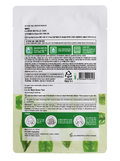 Изготовитель: "Etude Corporation", КОРЕЯ, РЕСПУБЛИКА, 100, Hangang-daero, Yongsan-gu, Seoul. Маска для лица на тканевой основе пропитана эссенцией, разработанной на основе экстракта зеленого чая. Этот компонент способствует активному питанию эпидермиса витаминами, минералами и полезными веществами, оказывает успокаивающее и заживляющее действие, устраняет угревую сыпь. Чайное дерево эффективно смягчает и разглаживает поверхность кожи, предупреждает преждевременное старение, уменьшает размер пор. Данный ингредиент нормализует деятельность сальных желез, а также активизирует процессы, отвечающие за выработку собственного коллагена. Способ применения: Приложить маску на очищенную и тонизированную кожу на 20-30 минут, затем снять, а остатки средства распределить по коже.