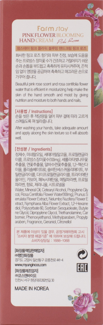 MYUNGIN COSMETICS CO. LTD., 441-4, Gongneungcheon-ro, Ilsandong-gu, Goyang-si, Gyeonggi-do, РЕСП. КОРЕЯ. Серия невероятно весенних, невероятно цветочных кремов для ухода за кожей рук. Текстура крема легкая, освежающая – такая же, как и аромат этого средства. Кожа после применения крема – такая же нежная, как изумительные цветочные лепестки. Кроме цветочных экстрактов в составе кремов ниацинамид (осветление пигментации и выравнивание тона кожи), аденозин (разглаживание морщин), гиалуроновая кислота (интенсивное увлажнение), витамин E ( антиоксидантная защита, предупреждение раннего увядания кожи). Крем для рук с экстрактом лепестков розыЭкстракт из лепестков розы подходит для ухода за любым типом кожи, мгновенно её увлажняет и освежает, устраняет сухость и шелушения, оказывает тонизирующее и успокаивающее действие, повышает эластичность кожи. Способ применения: Нанести на чистую сухую кожу рук мягкими массажными движениями.