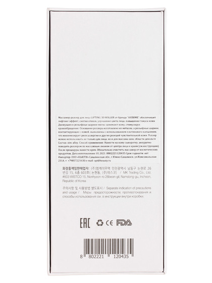 Изготовитель: MK Trading Co Ltd., Республика Корея, 14, Daejaengi-gil, Danwon-gu, Ansan-si, Gyeonggi-do. 3D-роллер с алмазной резкой ромбовидной формы и его универсальный V-образный дизайн предназначен для корректировки и моделирования контуров лица и тела. Благодаря двум рабочим роликовым поверхностям комфортно разминает кожу, оказывая на нее комплексное воздействие сравнимое с эффектом после спа-массажа: усиливает дренажные функции, снимает отечность, способствует улучшению тонуса мышц. Металл мягко воздействует на эпидермис, повышая его эластичность, и активизирует циркуляцию крови. Области применения: лицо, шея, руки, талия, ноги, ягодицы. Водонепроницаемый дизайн. Может использоваться с массажными кремами или после нанесения на лицо и тело ухаживающих косметических средств, способствуя их лучшему проникновению в эпидермис. При использовании с гелем для душа улучшает метаболизм кожи, сохраняет ее нежной гладкой.