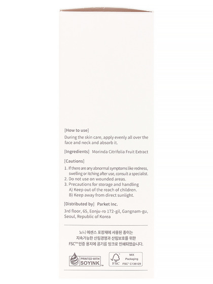 Изготовитель: Parket Inc., 3rd floor, 65, Eonju-ro 179-gil, Gangnam-gu, Seoul, Республика Корея. Эссенция с экстрактом нони, богатым витаминами, минералами и полифенолами, тонизирует кожу, восстанавливая её энергию и снимая стресс. Благодаря восстанавливающим свойствам эссенции уставшая и тусклая кожа становится сияющей и отдохнувшей. Средство глубоко питает и укрепляет кожу, повышая ее упругость и эластичность. Способ применения: нанесите небольшое количество эссенции на очищенную и тонизированную кожу подушечками пальцев или с помощью ватного диска.
