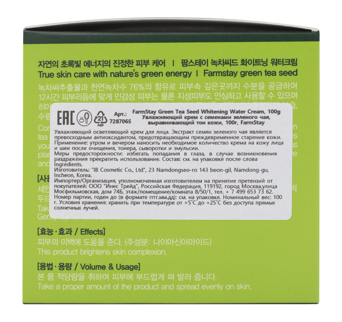 Изготовитель: MYUNGIN COSMETICS CO. LTD., 441-4, Gongneungcheon-ro, Ilsandong-gu, Goyang-si, Gyeonggi-do, РЕСП. КОРЕЯ. Увлажняющий осветляющий крем для лица. Экстракт семян зеленого чая является превосходным антиоксидантом, предотвращающим преждевременное старение кожи.