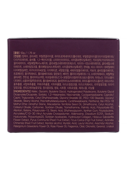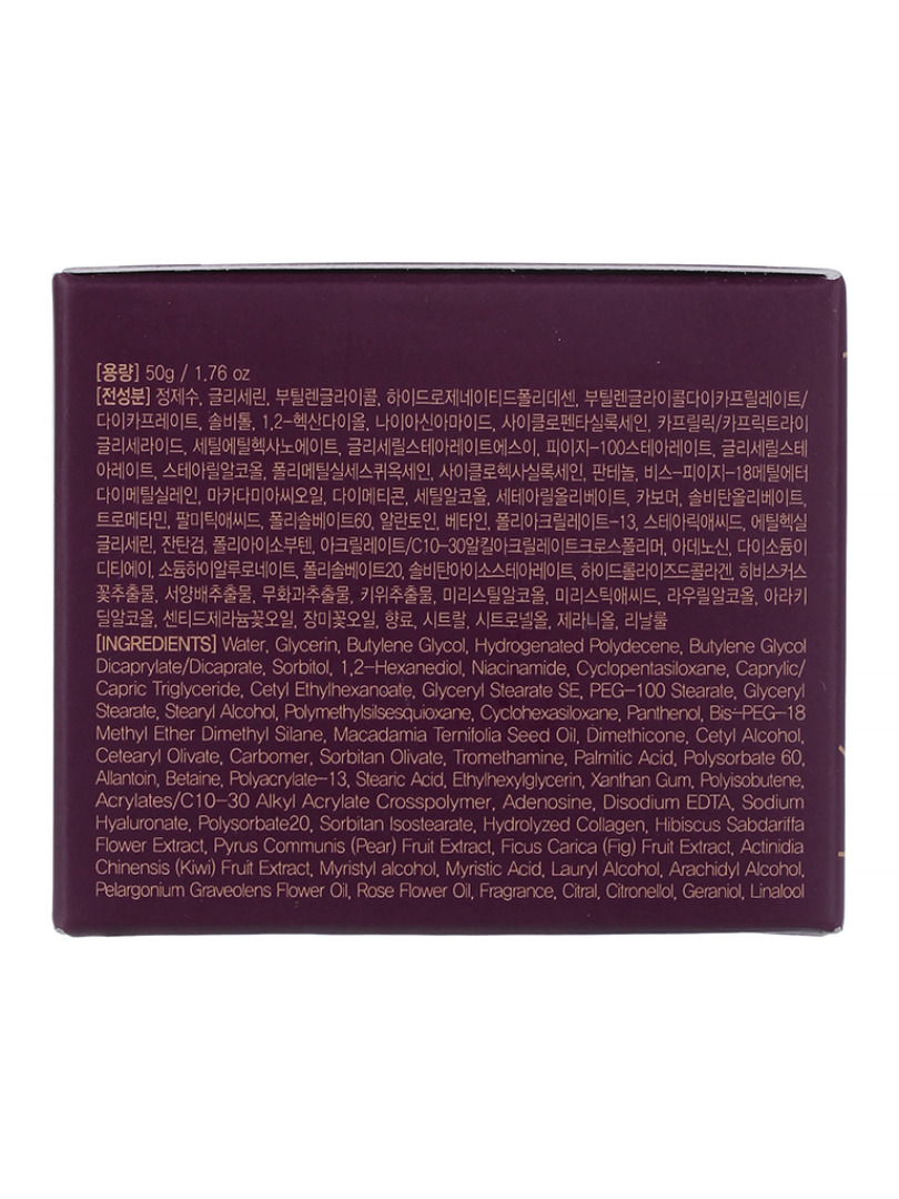 Water, Glycerin, Butylene Glycol, Hydrogenated Polydecene, Butylene Glycol Dicaprylate/Dicaprate, Sorbitol, 1,2-Hexanediol, Cyclopentasiloxane, Glyceryl Stearate SE, Cetyl Ethylhexanoate, Cetearyl Alcohol, Caprylic/Capric Triglyceride, PEG-100 Stearate, Glyceryl Stearate, Cyclohexasiloxane, Panthenol, Macadamia Ternifolia Seed Oil, Dimethicone, Bis-PEG-18 Methyl Ether Dimethyl Silane, Cetearyl Olivate, Stearyl Alcohol, Sorbitan Olivate, Carbomer, Tromethamine, Palmitic Acid, Polysorbate 60, Betaine, Allantoin, Pelargonium Graveolens Flower Oil, Polyacrylate-13, Stearic Acid, Ethylhexylglycerin, Xanthan Gum, Polyisobutene, Adenosine, Acrylates/C10-30 Alkyl Acrylate Crosspolymer, Disodium EDTA, Sodium Hyaluronate, Polysorbate 20, Sorbitan Isostearate, Hydrolyzed Collagen(0.005%), Pyrus Communis (Pear) Fruit Extract, Hibiscus Sabdariffa Flower Extract, Ficus Carica (Fig) Fruit Extract, Actinidia Chinensis (Kiwi) Fruit Extract, Myristic Acid, Rose Flower Oil, Fragrance, Polymethylsilsesquioxane