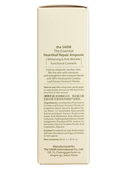 Изготовитель: THE SAEM INTERNATIONAL CO.LTD., КОРЕЯ, РЕСПУБЛИКА, 10F, 35, Cheonggyecheon-ro, Jongno-gu, Seoul. Сыворотка The Essential Heartleaf Repair Ampoule содержит 80% ферментированного экстракта листьев Heartleaf, извлеченного при низких температурах, и оказывает успокаивающее и увлажняющее действие. Три ингредиента, извлеченные из центеллы азиатской, заботятся о коже и укрепляют ее увлажняющий барьер. Его структура после впитывания образует увлажняющий крем, помогающий поддерживать комфорт кожи. Применение: Нанесите 2-3 капли на чистое лицо, предварительно обработав кожу тоником, и дайте ему впитаться.