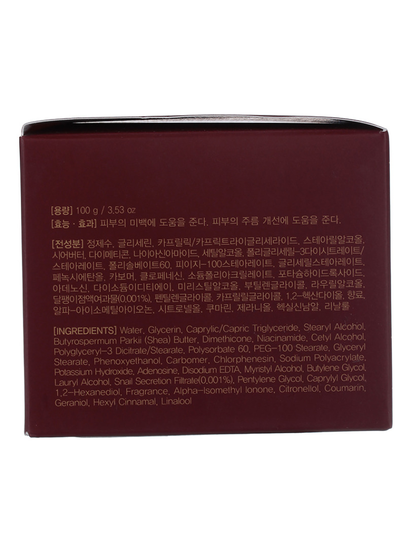 Water, Glycerin, Caprylic/Capric Triglyceride, Stearyl Alcohol, Butyrospermum Parkii (Shea) Butter, Dimethicone, Niacinamide, Cetyl Alcohol, Polyglyceryl-3 Dicitrate/Stearate, Polysorbate 60, PEG-100 Stearate, Glyceryl Stearate, Phenoxyethanol, Carbomer, Chlorphenesin, Sodium Polyacrylate, Potassium Hydroxide, Adenosine, Disodium EDTA, Myristyl alcohol, Butylene Glycol, Lauryl Alcohol, Snail Secretion Filtrate(0.001%), Pentylene Glycol, Caprylyl Glycol, 1,2-Hexanediol, Fragrance, Alpha-Isomethyl Ionone, Citronellol, Geraniol, Hexyl Cinnamal, Linalool, Butylphenyl Methylpropional