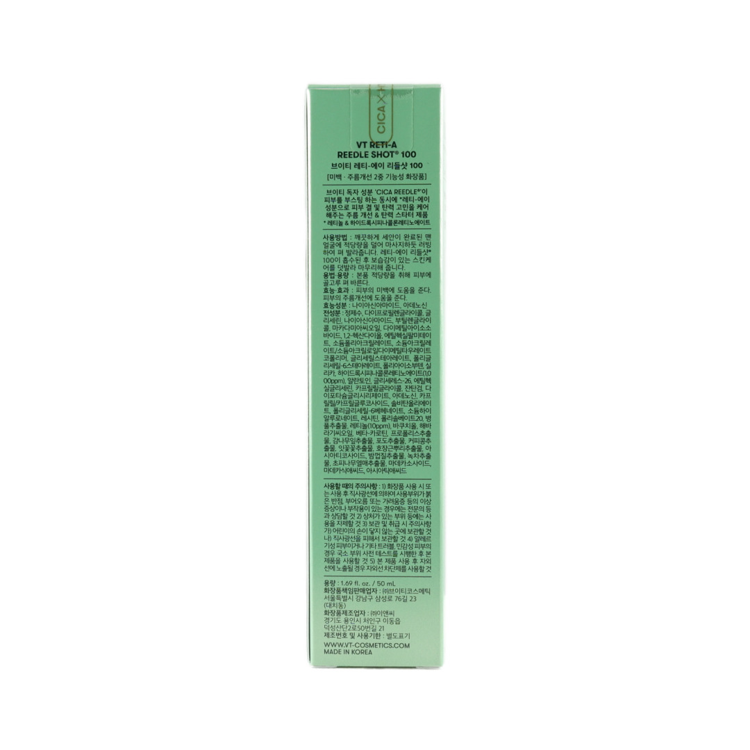 Изг-ль: VT COSMETIC CO., LTD., Республика Корея, 23, Samseong-ro 76-gil, Gangnam-gu, Seoul.Бустер-сыворотка VT Reti-A Reedle Shot 100 на основе ретинола и технологии микроигл Cica Reedle™ эффективно выравнивает рельеф кожи, сокращает морщины, поры и пигментацию. Мягко отшелушивает, усиливает обновление клеток, устраняет постакне и улучшает тон. Комплекс Cicahyalon™ с центеллой, гиалуроновой кислотой и прополисом глубоко увлажняет и успокаивает. Лёгкая эмульсионная текстура быстро впитывается. Подходит для жирной, комбинированной и проблемной кожи. Способ применения: Вечером после очищения нанести средство на сухую кожу, равномерно распределить, дать впитаться. Продолжить уход тоником и кремом. Утром обязательно использовать солнцезащитный крем SPF 50+. Избегать сочетания с кислотами, ретинолом, витамином C в высокой концентрации и скрабами. Возможны покалывания.