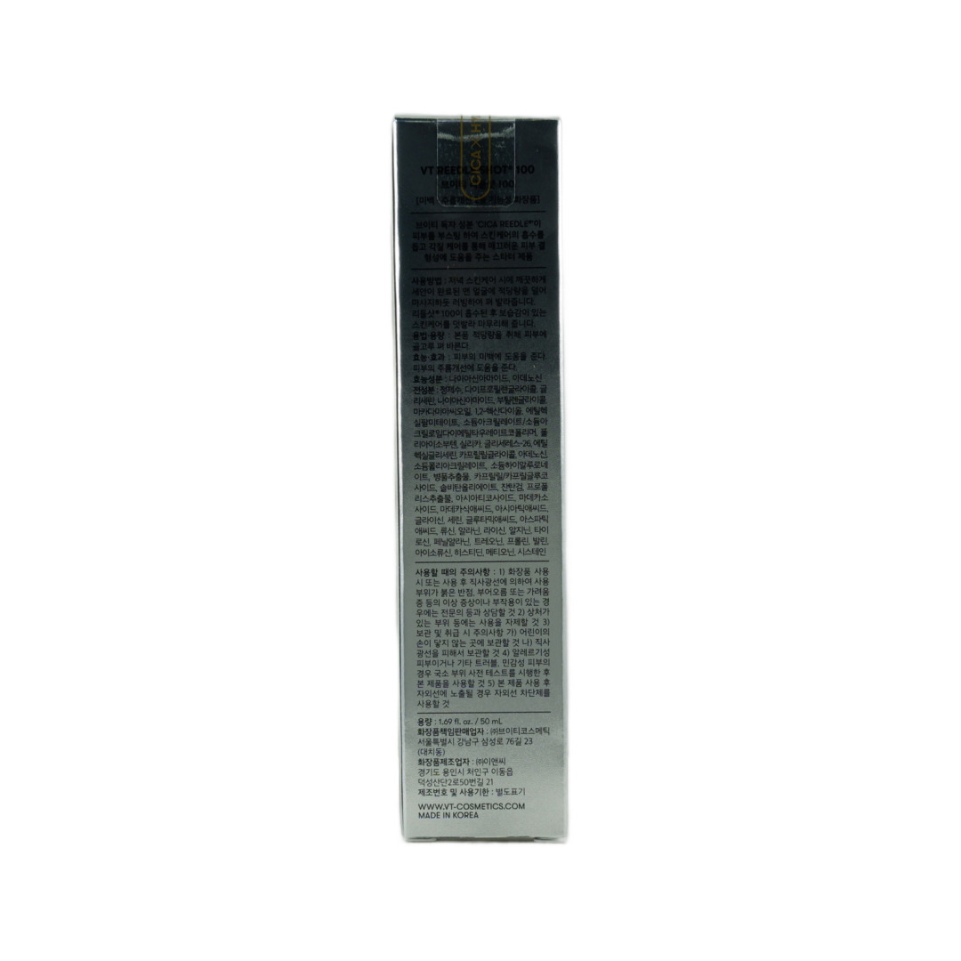 Изг-ль: VT COSMETIC CO., LTD., Республика Корея, 23, Samseong-ro 76-gil, Gangnam-gu, Seoul.Интенсивная бустер-сыворотка с микроиглами VT Reedle Shot 100 способствует восстановлению кожи, склонной к акне и раздражению. Делает поры менее заметными, выравнивает тон и осветляет пигментацию. Благодаря технологии CicaReedle™ с 95 000 микроигл и комплексу Cicahyalon™, активные компоненты проникают глубоко в эпидермис, увлажняют, укрепляют барьер и стимулируют обновление. Способ применения: Вечером после очищения нанести сыворотку на сухую кожу лица, равномерно распределить и дать впитаться. Затем завершить уход тоником и кремом. Утром обязательно наносить SPF 50+. Возможны лёгкие покалывания. Не сочетать с кислотами, ретинолом и скрабами.