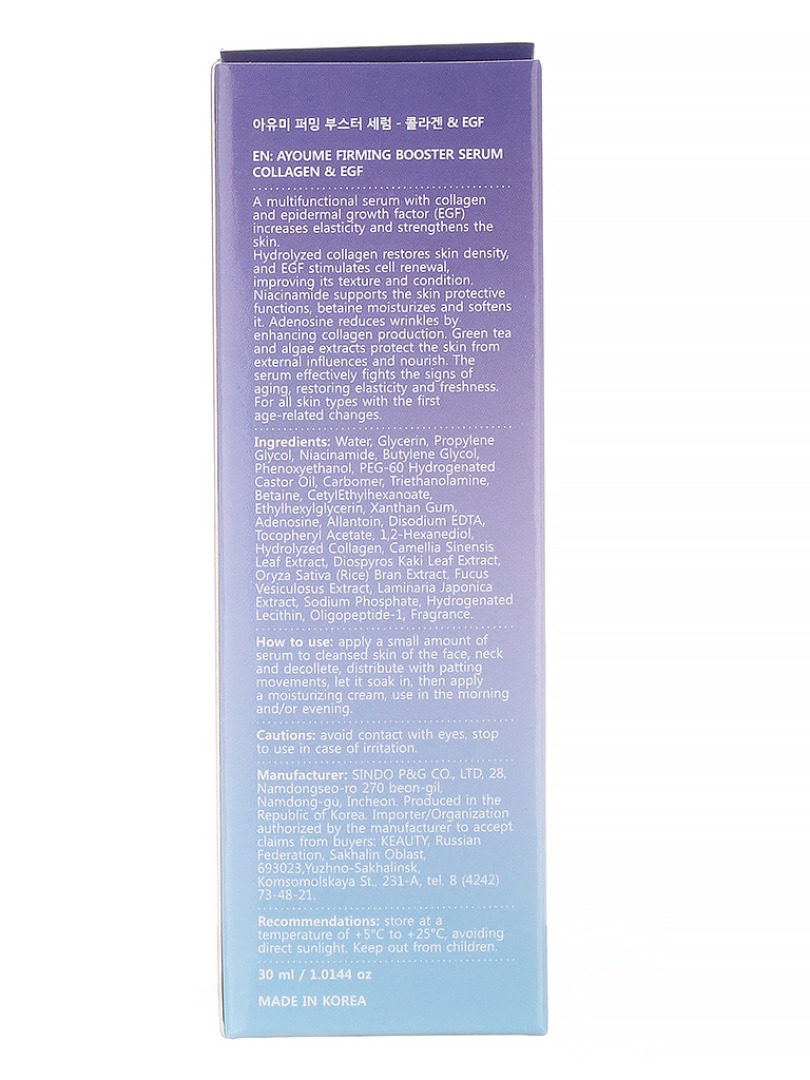 Изг-ль: SINDO P&G Co., LTD., Корея, Республика, 28, Namdongseo-ro 270 beon-gil, Namdong-gu, Incheon. Многофункциональная сыворотка с коллагеном и эпидермальным фактором роста (EGF) создана для повышения эластичности и укрепления кожи. Гидролизованный коллаген восстанавливает плотность кожи, а EGF стимулирует обновление клеток, улучшая ее текстуру и общее состояние. Ниацинамид поддерживает защитные функции кожи, бетаин увлажняет и смягчает ее. Аденозин сокращает морщины, усиливая выработку коллагена. Экстракты зеленого чая и водорослей оберегают кожу от внешних воздействий и питают. Сыворотка эффективно борется с признаками старения, возвращая коже упругость и свежесть. Для всех типов кожи с первыми возрастными изменениями. Применение: нанесите небольшое количество сыворотки на очищенную кожу лица, шеи и декольте, распределите похлопывающими движениями, дайте впитаться, затем нанесите увлажняющий крем, используйте утром и/или вечером. Меры предосторожности: избегать попадания в глаза, в случае возникновения раздражения прекратить использование.