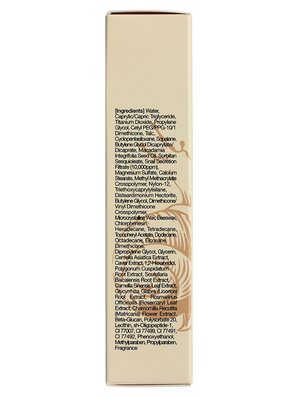 Water, Caprylic/Capric Triglyceride, Titanium Dioxide, Propylene Glycol, Cetyl PEG/PPG-10/1 Dimethicone, Talc, Cyclopentasiloxane, Squalane, Butylene Glycol Dicaprylate/Dicaprate, Macadamia Integrifolia Seed Oil, Sorbitan Sesquioleate, Snail Secretion Filtrate, Magnesium Sulfate, Calcium Stearate, Methyl Methacrylate Crosspolymer, Nylon-12, Triethoxycaprylylsilane, Disteardimonium Hectorite, Butylene Glycol, Dimethicone/Vinyl Dimethicone Crosspolymer, Microcrystalline Wax, Beeswax, Chlorphenesin, Hexadecane,Tetradecane, Tocopheryl Acetate, Dodecane, Octadecane, Eicosane, Dimethicone, Dipropylene Glycol, Glycerin, Centella Asiatica Extract, Caviar Extract,1,2-Hexanediol, Polygonum Cuspidatum Root Extract, Scutellaria Baicalensis Root Extract, Camellia Sinensis Leaf Extract, Glycyrrhiza Glabra (Licorice) Root Extract, Rosmarinus Officinalis (Rosemary) Leaf Extract, Chamomilla Recutita (Matricaria) Flower Extract, Beta-Glucan, Polysorbate 20, Lecithin, sh-Oligopeptide-1, CI 77007, CI 77499, CI 77491, CI 77492, Phenoxyethanol, Methylparaben, Propylparaben, Fragrance