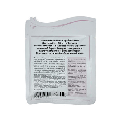 Изг-ль: LIGIAN Co.Ltd., Корея, Республика, 1F-101, 4, Gajeong-ro 37beon-gil, Seo-gu, Incheon. Маска с пробиотиком, разработанная для поддержания сияния кожи, способствует восстановлению микробиоме кожи, поддерживает баланс кожи и помогает укрепить ее защитные функции. Способ применения: Перед применением маски, нанесите на кожу лица тонер, сыворотку для усиления эффекта. Положить порошок мерной чашкой и воду (или активатор) в миску в соотношении на 100 мл порошка 80 мл воды, быстрыми движениями перемешайте до однородной массы при помощи шпателя, нанесите маску слоем 3-5 мм на очищенную кожу лица (скулы, нос, лоб), избегая области глаз. Оставить маску на 15-25 минут до застывания. Удалите все загрязнения, очистите лицо тонером, завершите основным средство по уходу за кожей.