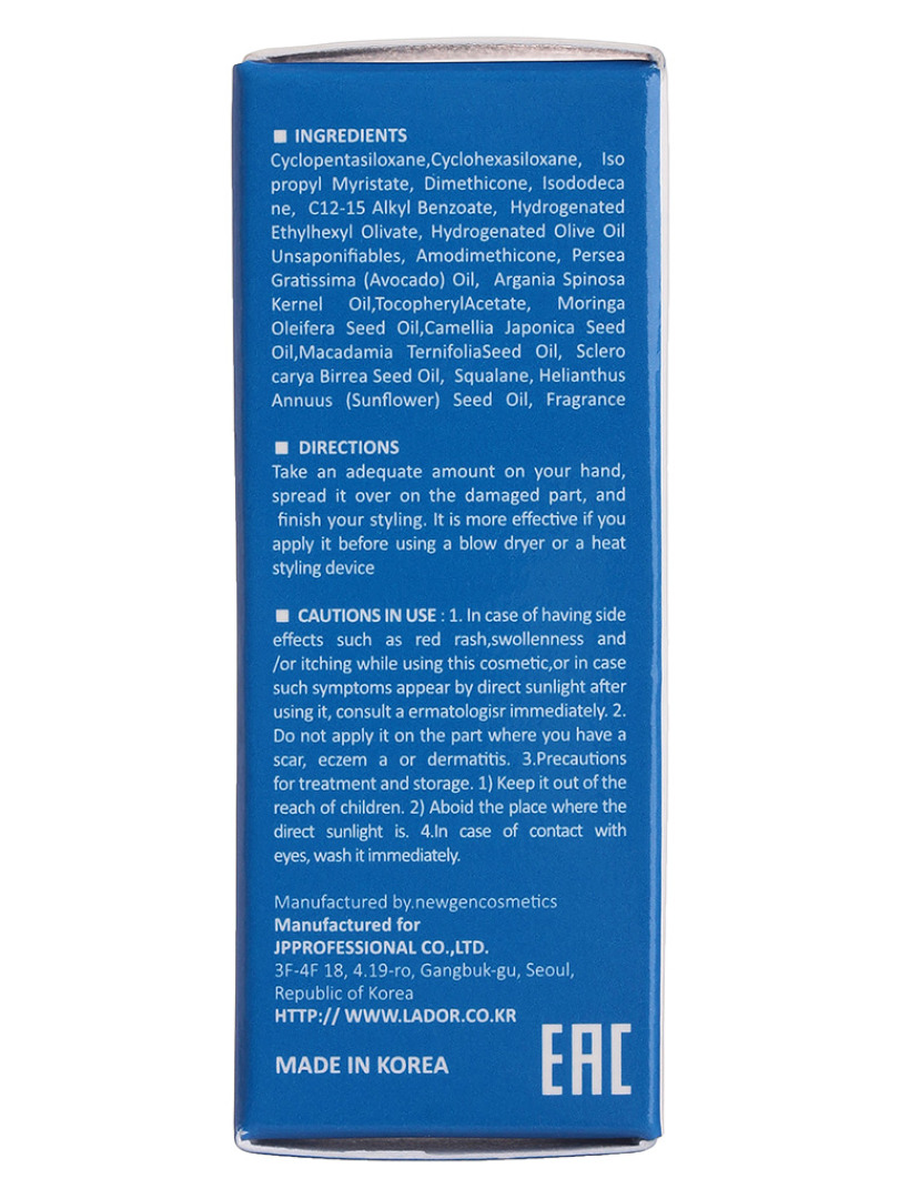 Изготовитель: NEWGEN COSMETICS CO., LTD., КОРЕЯ, РЕСПУБЛИКА, 12, Namdongseo-ro 113beon-gil, Namdong-gu, Incheon. Восстанавливающее средство для защиты волос при укладке феном и утюжком.Увлажняющее масло помогает вернуть ломким и сухим волосам блеск и шелковистость.Волосы становятся гладкими и блестящими. Способ применения: На вымытые и подсушенные волосы нанести масло, дать ему впитаться 2-3 мин. и закончить укладку.