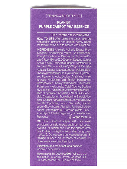 Изг-ль: DOORI COSMETICS Co., LTD., КОРЕЯ, РЕСПУБЛИКА, 588, Dabok-ro, Chubu-myeon, Geumsan-gun, Chungcheongnam-do. Эссенция для лица с экстрактом фиолетовой моркови, содержит мягкие PHA-ингредиенты, нежная эссенция не раздражает чувствительную кожу лица. 95% - отсутствие раздражения на коже лица, быстро впитывается, 90 % - тон кожи становится более равномерным, очищение от омертвевших клеток. Способ применения: нанесите необходимое количество средства на лица, слегка постучите кончиками пальцев для лучшего впитывания.