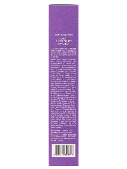 Изг-ль: DOORI COSMETICS Co., LTD., КОРЕЯ, РЕСПУБЛИКА, 588, Dabok-ro, Chubu-myeon, Geumsan-gun, Chungcheongnam-do. Крем для лица с экстрактом фиолетовой моркови, содержит мягкие PHA-ингредиенты. 95% - увлажнение, тон кожи становится более равномерным, текстура кожи становится мягкой и нежной, 90 % - очищение от омертвевших клеток. Способ применения: после очищения и тонизирования кожи нанесите крем.