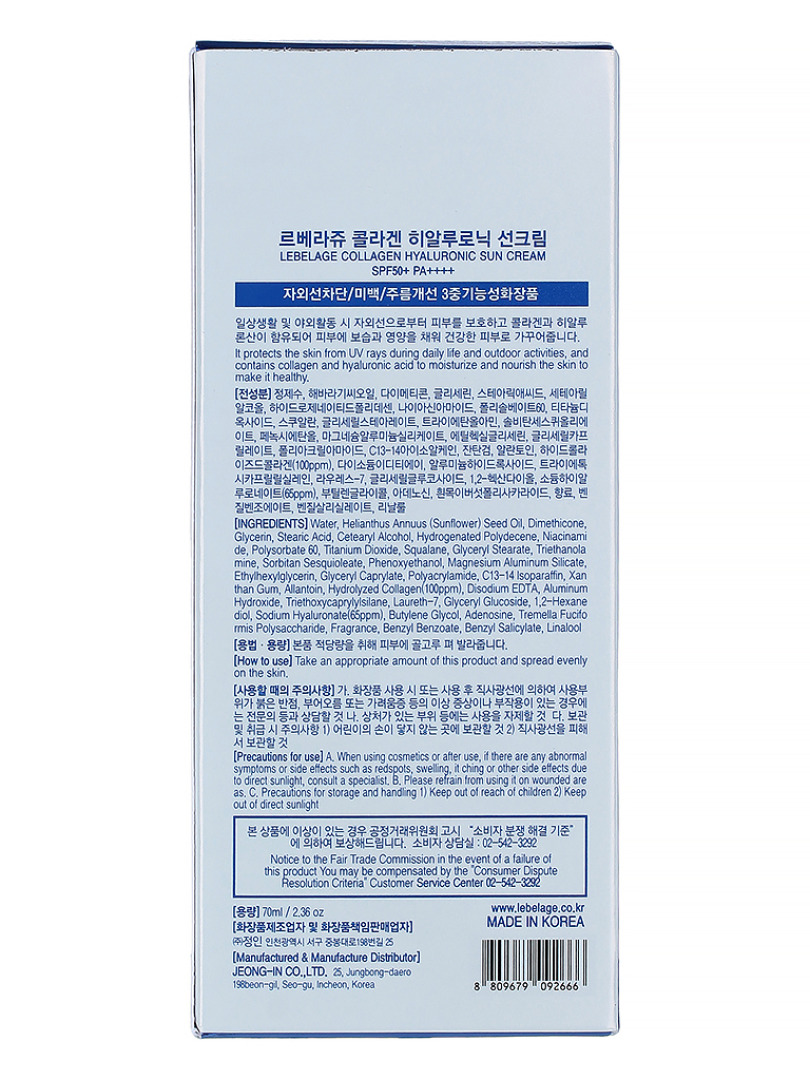 Изг-ль: LB Cosmetic, Корея, Республика, 27, Jangreung-ro,Pungmu-dong, Gimpo-si, Gyeonggi-do. Солнцезащитный крем (SPF50+ PA+++) с коллагеном и гиалуроновой кислотой надёжно оберегает кожу от всех видов ультрафиолетового излучения, предупреждая фотостарение. Способ применения: необходимое количество крема равномерно нанесите на кожу перед выходом на улицу. Уменьшение количества крема или неравномерное распределение значительно снизит уровень защиты. Не рекомендуется долгое нахождение на солнце, даже при использовании солнцезащитного крема.