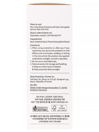 Изготовитель: Parket Inc., 3rd floor, 65, Eonju-ro 182-gil, Gangnam-gu, Seoul, Республика Корея. Эссенция с экстрактом корня женьшеня Panax, богатым сапонинами, питает кожу и повышает её эластичность, наполняя кожу энергией молодости. Лёгкое средство дарит увлажнение и оказывает антиоксидантное действие, уменьшая видимость морщин и улучшая тон тусклой, уставшей кожи. Способ применения: нанесите небольшое количество эссенции на очищенную и тонизированную кожу подушечками пальцев или с помощью ватного диска.