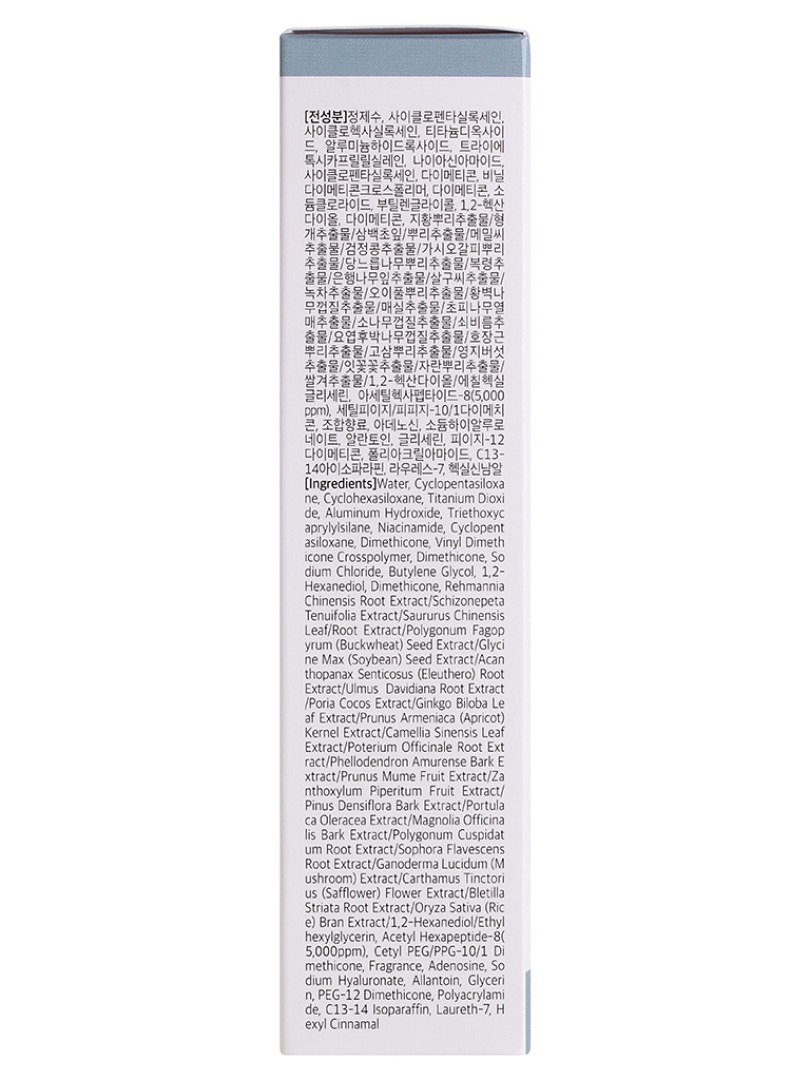 Water, Cyclopentasiloxane, Cyclohexasiloxane, Titanium Dioxide , Aluminum Hydroxide, Triethoxycaprylylsilane, Niacinamide, Cyclopentasiloxane, Dimethicone/Vinyl Dimethicone Crosspolymer, Dimethicone, Sodium Chloride, Butylene Glycol, 1,2-Hexanediol, Dimethicone, Rehmannia Chinensis Root Extract,, Schizonepeta Tenuifolia Extract, Saururus Chinensis Leaf/Root Extract, Polygonum Fagopyrum (Buckwheat) Seed Extract, Glycine Max (Soybean) Seed Extract, Acanthopanax Senticosus (Eleuthero) Root Extract, Ulmus Davidiana Root Extract, Poria Cocos Extract, Ginkgo Biloba Leaf Extract, Prunus Armeniaca (Apricot) Kernel Extract, Camellia Sinensis Leaf Extract, Poterium Officinale Root Extract, Phellodendron Amurense Bark Extract, Prunus Mume Fruit Extract, Zanthoxylum Piperitum Fruit Extract, Pinus Densiflora Bark Extract, Portulaca Oleracea Extract, Magnolia Officinalis Bark Extract, Polygonum Cuspidatum Root Extract, Sophora Flavescens Root Extract, Ganoderma Lucidum (Mushroom) Extract, Carthamus Tinctorius (Safflower) Flower Extract, Bletilla Striata Root Extract, Oryza Sativa (Rice) Bran Extract, 1,2-Hexanediol,, Ethylhexylglycerin, Acetyl Hexapeptide-8, Cetyl PEG/PPG-10/1 Dimethicone, Fragrance, Adenosine, Sodium Hyaluronate, Allantoin, Glycerin, PEG-12 Dimethicone, Polyacrylamide, C13-14 Isoparaffin, Laureth-, Hexyl Cinnamal