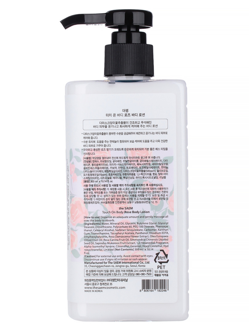 Изг-ль: THE SAEM INTERNATIONAL CO.LTD., КОРЕЯ, РЕСПУБЛИКА, 10F, 35, Cheonggyecheon-ro, Jongno-gu, Seoul. Лосьон для тела с экстрактом розы, содержит смесь растительных компонентов, включая оливковое масло и масло жожоба, которые питают и разглаживают кожу. Пантенол оказывает успокаивающее и увлажняющее действие, укрепляя кожный барьер. Текстура лосьона, как и аромат, очень приятная, хорошо распределяется по коже, мгновенно увлажняет кожу и оставляет ее увлажненной в течение длительного времени. Способ применения: нанести на чистую сухую кожу тела.