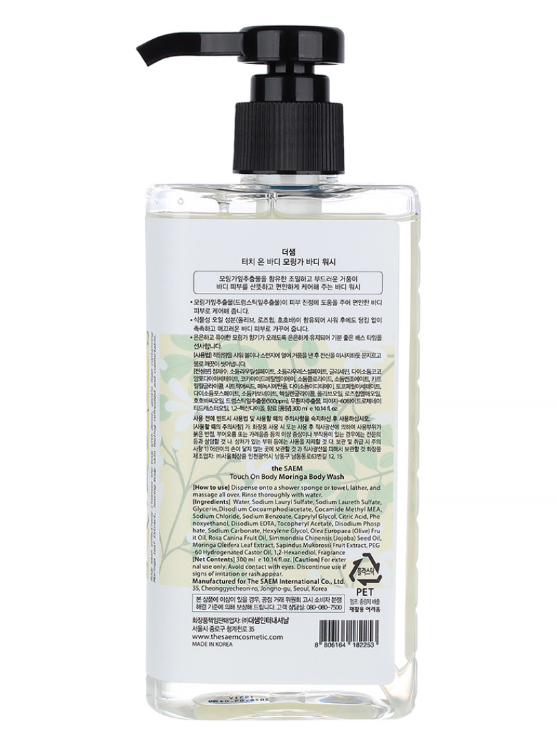 Изг-ль: THE SAEM INTERNATIONAL CO.LTD., КОРЕЯ, РЕСПУБЛИКА, 10F, 35, Cheonggyecheon-ro, Jongno-gu, Seoul. Гель для душа с экстрактом моринги. Содержит оливковое масло, масло шиповника и масло жожоба, чтобы сохранить кожу гладкой и увлажненной после душа. Экстракт листьев моринги увлажняет и успокаивает раздраженную кожу. Обладает смягчающими и тонизирующими свойствами, в результате чего кожа обретает обворожительную шелковистость и упругость. Способ применения: нанести на губку и взбить пену, после чего распределить ее по коже и помассировать. Тщательно смыть водой.