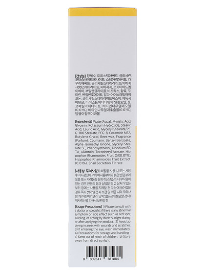 Purified water, Myristic Acid, Glycerin, Potassium Hvdroxide, Stearic Acid, Laurie Acid, Glycetyl Stearate/PEG-100 Stearate, PEG-8, Cocamide MEA, Butylene Glycol, Beeswax, Fragrance, Coumarin, Benzyl Benzoate, Alpha-lsomethyl lonone, Glyceryl Stearate SE, Phenoxyethanol, Disodium EDTA, Allantoin, Tocopheryl Acetate, Hippophae Rhamnoides Fruit Oil, Hippophae Rhaninoides Fruit Extract, Snail Secretion Filtrate