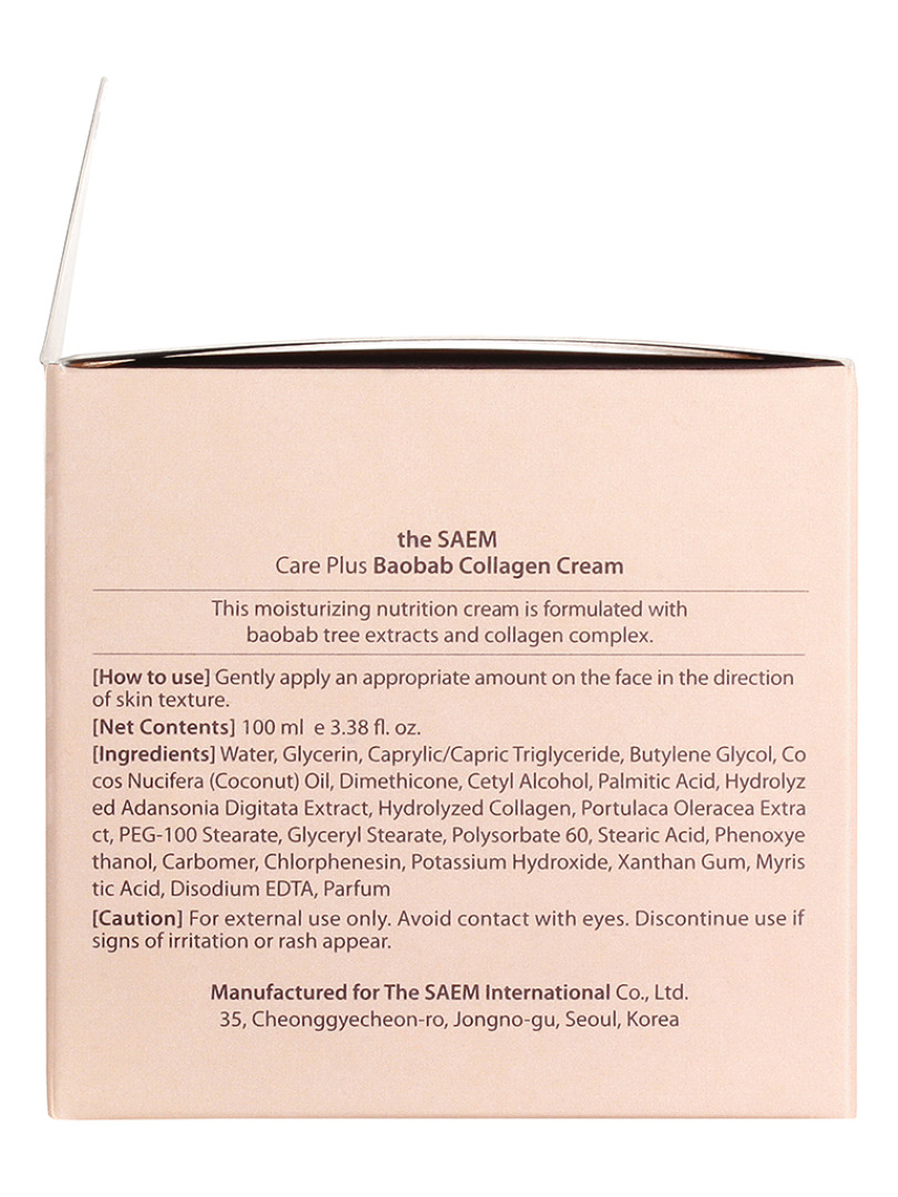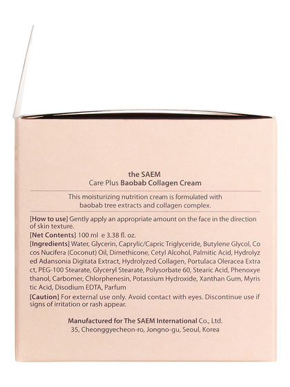 Изг-ль: The Saem International Co., Ltd., КОРЕЯ, РЕСПУБЛИКА, 10F, 35, Cheonggyecheon-ro, Jongno-gu, Seoul. Увлажняющий крем для лица с 30% содержанием коллагена и с экстрактом баобаба. Экзотическое тропическое дерево содержит в большом количестве все вещества, необходимые для здоровья кожи – изумительно насыщает ее влагой, повышает эластичность кожных покровов и восстанавливает их при возрастных изменениях. Надежно защищает кожу от преждевременного старения. Применение: распределить по лицу мягкими массажными движениями на последнем этапе ухода за кожей.