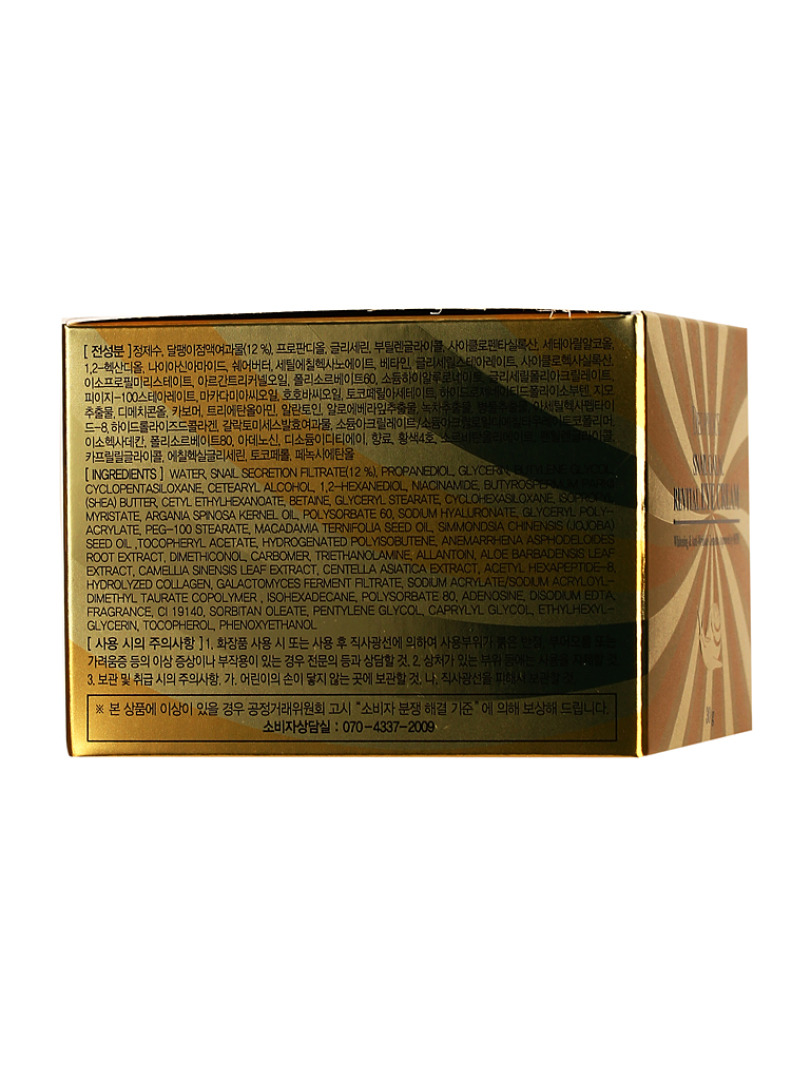 Water, snail secretion filtrate, glycerin, butylene glycol, cyclopentasiloxane, cyclohexasiloxane, cetearyl alcohol, butyrospermum parkii (shea butter), niacinamide, cetyl ethylhexanoate, cyclopentasiloxane, dimethiconol, 1,2-hexanediol, betaine, glyceryl polyacrylate
