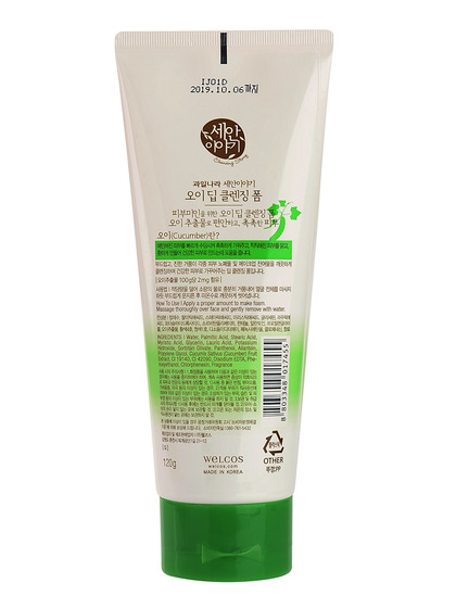 Изг-ль: Welcos Co., LTD., КОРЕЯ, РЕСПУБЛИКА, 21-12, Toegyegongdan 1-gil, Chuncheon-si, Gangwon-do. Пенка для умывания с экстрактом огруцов устраняет загрязнения, удаляет макияж, при этом не нарушая липидный (защитный) слой кожи. Помогает поддержать водный баланс кожи, мягко удаляет загрязнения из пор и омертвевшие клетки кожи, не пересушивая ее, подходит для всех типов кожи, в том числе сухой и чувствительной. Способ применения: вспенить средство и нанести на кожу лица массирующими движениями, затем смыть теплой водой.