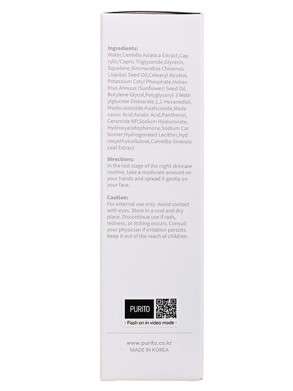 Изготовитель: HINATURE CO.LTD., Республика Корея, 21990 Smart Valley E dong 908 ho, Songdo Mirae-ro 30, Yeonsu-gu, Incheon-si. Purito Dermide Cica Barrier Sleeping Pack – это ночная маска использует силу экстракта центеллы и предназначена для активного ночного ухода за кожей. Благодаря высокому содержанию экстракта центеллы средство имеет ярковыраженные увлажняющие, противовоспалительные, ранозаживляющие качества. Так же в составе средства церамиды и гиалуроновая кислота. Образуя на коже эластичный слой, маска быстро восполняет недостаток влаги, освежает, убирает признаки раздражения и стресса. Способ применения: нанести необходимое количество маски завершающим этапом ухода за лицом. Не смывать.