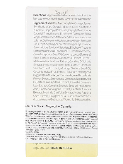 Изг-ль: COSMAX, INC., 27, Jeyakgongdan 1-gil, 46, Jeyakgongdan 2-gil, Hyangnam-eup, Hwaseong-si, Gyeonggi-do, Республика Корея. Матирующий солнцезащитный стик обеспечивает надёжную защиту от ультрафиолета, оставляя естественный матовый финиш без липкости и жирной плёнки. Средство препятствует появлению солнечных ожогов, пигментации и фотостарения, предотвращает жирный блеск. Содержит фотостабильные химические УФ-фильтры, экстракты полыни, зелёного чая, центеллы, дерева ним и баклажана, а также пантенол, янтарный порошок и нитрид бора. Способ применения: после всех этапов дневного ухода нанесите стик на лицо в 3-4 слоя.