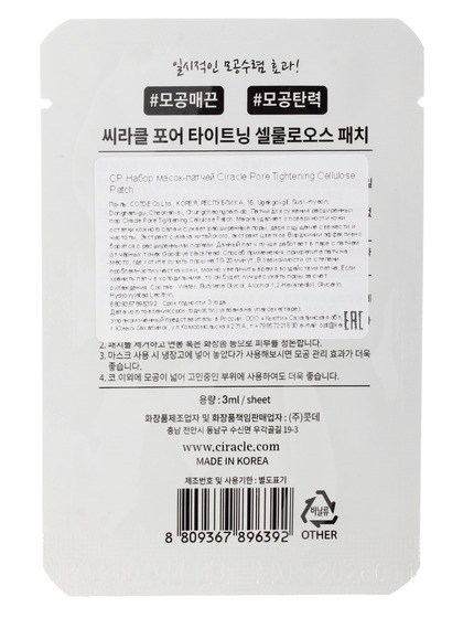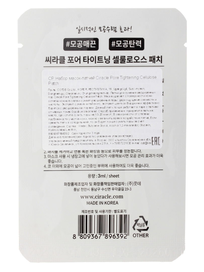 Изготовитель: COTDE Co.Ltd., КОРЕЯ, РЕСПУБЛИКА, 16, Ugakgol-gil, Susi -myeon, Dongnam-gu, Cheonan-si, Chungcheongnam-do. Салфетки для сужения расширенных пор Ciracle Pore Tightening Cellulose Patch. Салфетка удаляет с поверхности кожи остатки кожного сала и сужает расширенные поры, даря ощущение свежести и чистоты. Экстракт сумаха китайского, экстракт цветков Вирджинии эффективно борятся с расширенными порами. Салфетка лучше работает в паре с салфеткой от чёрных точек Goodbye blackhead. Способ применения: прикрепите салфетку на место, где хотите сузить поры на 10-20 минут; В зависимости от степени проблемности участка кожи, можно увеличить время воздействия; Если хранить салфетки в холодильнике, то они будут лучше сужать поры за счет охлаждения.