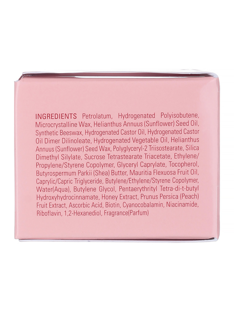 Petrolatum, Hydrogenated Polyisobutene, Microcrystalline Wax, Helianthus Annuus (Sunflower) Seed Oil, Synthetic Beeswax, Hydrogenated Castor Oil, Hydrogenated Castor Oil Dimer Dilinoleate, Hydrogenated Vegetable Oil, Helianthus Annuus (Sunflower) Seed Wax, Polyglyceryl-2 Triisostearate, Silica Dimethyl Silylate, Sucrose Tetrastearate Triacetate, Ethylene/Propylene/Styrene Copolymer, Fragrance, Glyceryl Caprylate, Tocopherol, Butyrospermum Parkii (Shea) Butter, Mauritia Flexuosa Fruit Oil, Caprylic/Capric Triglyceride, Butylene/Ethylene/Styrene Copolymer, Water, Butylene Glycol, Pentaerythrityl Tetra-di-t-butyl Hydroxyhydrocinnamate, Honey Extract, 1,2-Hexanediol, Prunus Persica (Peach) Fruit Extract, Ascorbic Acid, Biotin, Cyanocobalamin, Niacinamide, Riboflavin