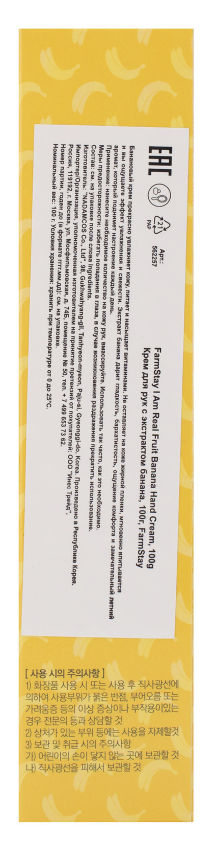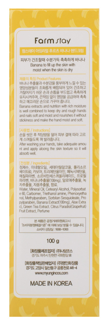 MYUNGIN COSMETICS CO. LTD., 441-4, Gongneungcheon-ro, Ilsandong-gu, Goyang-si, Gyeonggi-do, РЕСП. КОРЕЯ. Крем для рук с экстрактом банана оказывает питательное и увлажняющее действие, смягчает и разглаживает кожу, делает ее более упругой, молодой и красивой. Особо хорошо крем воздействует на чувствительную и усталую кожу: оказывает релаксирующее и успокаивающее действие, снимает раздражения и покраснения. Также крем защищает кожу от неблагоприятного воздействия внешней среды.Также в составе крема экстракты алоэ, зеленого чая и грейпфрута, которые усиливают оздоравливающее действие крема, делают кожу рук еще более гладкой, мягкой, ухоженной. Крем быстро впитывается, не оставляя жирной или липкой пленки, окутывает кожу рук замечательным ароматом сочного фрукта, который дарит хорошее настроение в течение дня. Способ применения: Нанести на чистую сухую кожу рук легкими массирующими движениями.