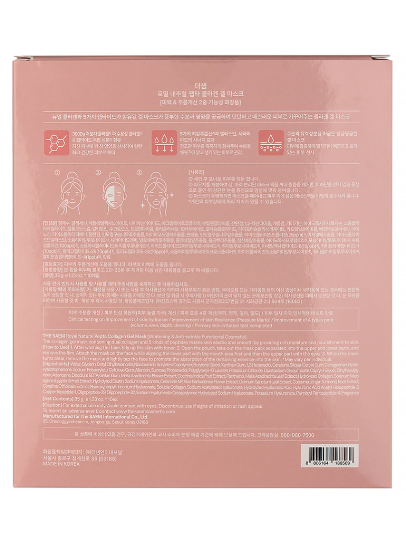 Изг-ль: THE SAEM INTERNATIONAL CO., LTD., Корея, Республика, 10F, 35, Cheonggyecheon-ro, Jongno-gu, Seoul. Коллагеновая гелевая маска содержит двойной коллаген и 5 видов пептид, которая делает кожу упругой и гладкой. Улучшает эластичность кожи и ее восстановление, решает основные проблемы с порами, повышает увлажнение кожи благодаря гелевой текстуре. Гиалуроновая кислота помогает сохранить усвоенный коллаген, эластин обеспечивает увлажняющий барьер, церамиды защищают кожу. Способ применения: после очищения подготовьте кожу с помощью тонера, снимите пленку с маски и сначала нанесите нижнюю часть макси, затем верхнюю, когда маска станет прозрачной снимите и распределите оставшуюся эссенцию по коже лица.