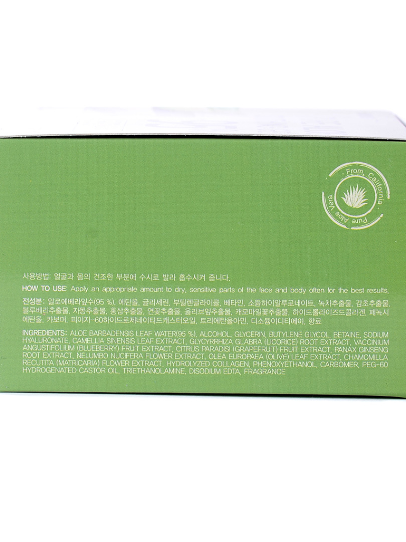 Изготовитель: GREENCOS Co.Ltd., Республика Корея, 64-30, Hagunsandan 1-ro, Yangchon-eup, Gimpo-si, Gyeonggi-do. Многофункциональный гель алое 95% состоит из чистого сока Алоэ, который обладает уникальными увлажняющими, успокаивающими и ранозаживляющими свойствами, оказывает лечебное действие на воспаленную, раздраженную кожу, а так же заживляет ожоги и защищает от ультрафиолетовых лучей, стимулирует регенерацию клеток. Алоэ при жирной кожи способствует предотвращению появления прыщей, угрей. Применение: Алое гель используется для увлажнения лица и тела, успокаивающих масок для лица, век, а так же маски для волос.