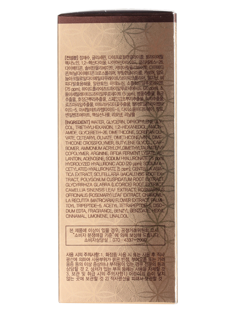 Water, Glycerin, Dipropylene glycol, Triethylhexanoin, 1,2-hexanediol, Niacinamide, Glycereth-26, Dimethicone, Sorbitan olivate , Cetearyl olivate, Sodium hyaluronate, Hydrolyzed hyaluronic acid, Sodium acetylated hyaluronate, Palmitoyl tripeptide-5 , Acetyl tetrapeptide-5, Bifida ferment lysate, Scutellaria baicalensis root extract, Rosmarinus officinalis (rosemary) leaf extract, Polygonum cuspidatum root extract, Glycyrrhiza glabra (licorice) root extract, Chamomilla recutita (matricaria) flower extract, Centella asiatica extract, Camellia sinensis leaf extract, Allantoin, Adenosine, Butylene glycol, T-butyl alcohol, Dimethicone/vinyl dimethicone crosspolymer, Ammonium acryloyldimethyltaurate/vp copolymer, Carbomer , Arginine, Disodium edta, Fragrance