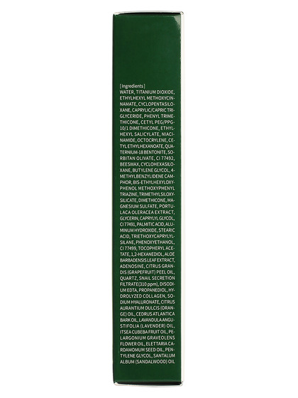 Water, Titanium Dioxide, Ethylhexyl Methoxycinnamate, Cyclopentasiloxane, Caprylic/Capric Triglyceride, Phenyl Trimethicone, Cetyl PEG/PPG-10/1 Dimethicone, Ethyl-hexyl Salicylate, Niacinamide, Octocrylene, Cetyl Ethylhexanoate, Quaternium-18 Bentonite, Sorbitian Olivate, Beeswax, Cyclohexasiloxane, Butylene Glycol, 4-Methylbenzylidene Canphor, Bis-EthylhexyloxyphenolMethoxyphenyl Triazine, Trimethylsiloxysilicate, Dimethicone, Magnesium Sulfate, Portulaca Oleracea Extract, CI 77492, Glycerin, Caprylyl Glycol, CI77491, Triethoxycaprylylsilane, Palmitic Acid, Stearic Acid, Phenoxyethanol, Aluminum Hydroxide, CI77499, Tocopheryl Acetate, 1,2-Hexanediol, Aloe Barbadensis Leaf Exaact, Adenosine, Citrus Grandis (Grapefruit) Peel Oil, Quartz, Snail Secretion Filtrate (310ppm), Disodium EDTA, Propanediol, Hydrolyzed Collagen, Sodium Hyaluronate, Citrus Aurantium Dulcis (Orange) Oil, Cedrus Atlantica Bark Oil, Lavandula Angustifolia (Lavender) Oil, Litsea Cubeba Fruit Oil, Pelargonium Graveolens Flower Oil, Elettaria Cardamomum Seed Oil, Pentylene Glycol, Santalum Album (Sandalwood) Oil