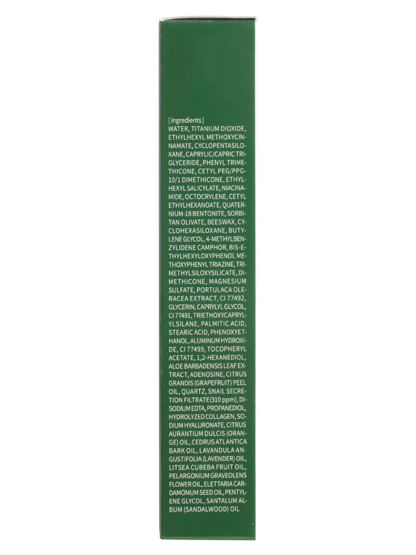 Water, Titanium dioxide, Ethylhexyl methoxycinnamate, Cyclopentasiloxane, Caprylic/capric triglyceride , Phenyl trimethicone, Cetyl peg/ppg-10/1 dimethicone , Ethylhexyl salicylate, Niacinamide, Octocrylene, Cetyl ethylhexanoate, Quaternium-18 bentonite , Sorbitan olivate, Beeswax, Cyclohexasiloxane, Butylene glycol, 4-methylbenzylidene camphor, Bis-ethylhexyloxyphenol methoxyphenyl triazine, Trimethylsiloxysilicate, Dimethicone, Magnesium sulfate, Portulaca oleracea extract, Ci 77492 , Glycerin, Caprylyl glycol , Ci 77491 , Triethoxycaprylylsilane, Palmitic acid, Stearic acid, Phenoxyethanol, Aluminum hydroxide, Ci 77499 , Tocopheryl acetate, 1,2-hexanediol, Adenosine, Citrus grandis (grapefruit) peel oil, Quartz , Snail secretion filtrate , Disodium edta, Propanediol , Centella asiatica extract, Hydrolyzed collagen, Sodium hyaluronate, Citrus aurantium dulcis (orange) oil, Cedrus atlantica bark oil, Lavandula angustifolia (lavender) oil, Litsea cubeba fruit oil, Pelargonium graveolens flower oil, Elettaria cardamomum seed oil, Santalum album (sandalwood) oil, Ethylhexylglycerin, Acetyl hexapeptide-8