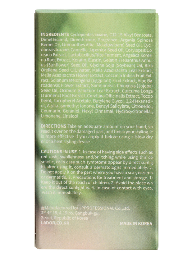 Cyclopentasiloxane, C12-15 Alkyl Benzoate, Dimethiconol, Dimethicone, Fragrance, Argania Spinosa Kernel Oil, Camellia Japonica Seed Oil, Limnanthes Alba (Meadowfoam) Seed Oil, Tocopheryl Acetate, Water, Cyclohexasiloxane, Helianthus Annuus (Sunflower) Seed Oil, Benzyl Salicylate, Linalool, Melia Azadirachta Leaf Extract, Hexyl Cinnamal, Melia Azadirachta Flower Extract, Hydroxycitronellal, Citronellol, Butylene Glycol, Glycine Soja (Soybean) Oil, Coccinia Indica Fruit Extract, Alpha-Isomethyl Ionone, Limonene, 1,2-Hexanediol, Aloe Barbadensis Flower Extract, Solanum Melongena (Eggplant) Fruit Extract, Geraniol, Coumarin, Simmondsia Chinensis (Jojoba) Seed Oil, Angelica Koreana Root Extract, Corallina Officinalis Extract, Curcuma Longa (Turmeric) Root Extract, Lactobacillus/Rice Ferment, Ocimum Sanctum Leaf Extract, Bixa Orellana Seed Oil, Corylopsis Coreana Extract, Elastin, Keratin, Tocopherol, Gelatin