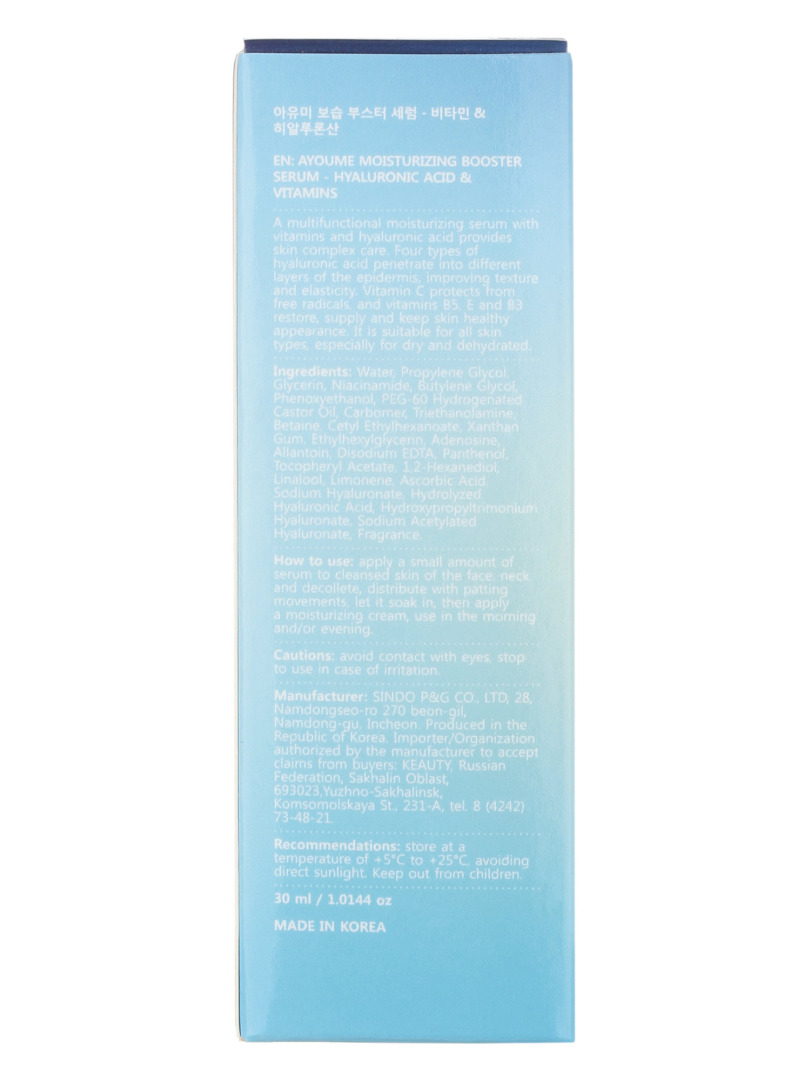 Изг-ль: SINDO P&G Co., LTD., Корея, Республика, 28, Namdongseo-ro 270 beon-gil, Namdong-gu, Incheon. Многофункциональная увлажняющая сыворотка с витаминами и гиалуроновой кислотой обеспечивает комплексный уход за кожей. Четыре вида гиалуроновой кислоты проникают в различные слои эпидермиса, улучшая текстуру и упругость. Витамин C защищает кожу от свободных радикалов, а витамины B5, E и В3 способствуют ее восстановлению, питанию и поддержанию здорового внешнего вида. Подходит для всех типов кожи, особенно для сухой и обезвоженной. Применение: нанесите небольшое количество сыворотки на очищенную кожу лица, шеи и декольте, распределите похлопывающими движениями, дайте впитаться, затем нанесите увлажняющий крем, используйте утром и/или вечером. Меры предосторожности: избегать попадания в глаза, в случае возникновения раздражения прекратить использование.