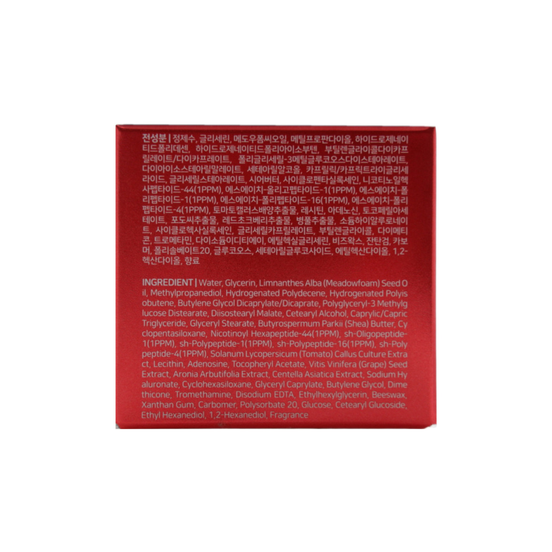 Water, Glycerin, Hydrogenated Polydecene, Hydrogenated Polyisobutene, Limnanthes Alba (Meadowfoam) Seed Oil, Methylpropanediol, Butylene Glycol Dicaprylate/Dicaprate, Polyglyceryl-3 Methylglucose Distearate, Diisostearyl Malate, Cetearyl Alcohol, Caprylic/Capric Triglyceride, Glyceryl Stearate, Butyrospermum Parkii (Shea) Butter, Cyclopentasiloxane, Cyclohexasiloxane, Beeswax, Dimethicone, Tocopheryl Acetate, Ethyl Hexanediol, Fragrance, Glyceryl Caprylate, Carbomer, Cetearyl Glucoside, Tromethamine, Adenosine, Xanthan Gum, Solanum Lycopersicum (Tomato) Callus Culture Extract, 1,2-Hexanediol, Disodium EDTA, Sodium Hyaluronate, Glucose, Butylene Glycol, Aronia Arbutifolia Extract, Centella Asiatica Extract, Ethylhexylglycerin, Nicotinoyl Hexapeptide-44, sh-Oligopeptide-1, sh-Polypeptide-1, sh-Polypeptide-16, sh-Polypeptide-4, Vitis Vinifera (Grape) Seed Extract, Polysorbate 20, Lecithin