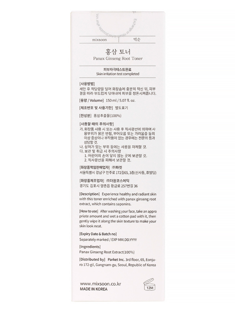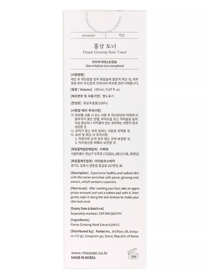 Изготовитель: Parket Inc., 3rd floor, 65, Eonju-ro 196-gil, Gangnam-gu, Seoul, Республика Корея. Тонер содержит 100 % экстракт корня красного женьшеня Panax (4-6 летней выдержки), который глубоко питает и оживляет кожу одновременно обеспечивает омолаживающий эффект, поддерживает эластичность кожи. Красный женьшень содержит, гинсенозиды, которые обладают антиоксидантными и противовоспалительными свойствами. Способ применения: после очищения кожи лица нанесите тонер на ватный диск и протрите диском лицо..
