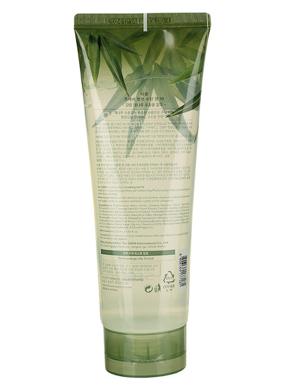 Изготовитель: THE SAEM INTERNATIONAL CO.LTD., КОРЕЯ, РЕСПУБЛИКА, 10F, 35, Cheonggyecheon-ro, Jongno-gu, Seoul. Универсальный гель для лица и тела на основе сока бамбука Fresh Bamboo Soothing Gel 99%. Сок бамбука смягчает, успокаивает и освежает кожу, наполняет ее влагой, делает мягкой и бархатистой. Также средство борется с первыми признаками старения, при этом препятствует появлению различных несовершенств, дарит коже ощущение свежести и комфорта. Сок бамбука способствуют рассасыванию отеков и гематом, борется с растяжками и целлюлитом. Идеально подходит для регулярного применения для максимального увлажнения кожи. Имеет легкий ненавязчивый аромат. Применение: нанесите на чистую кожу и равномерно распределите легкими похлопывающими движениями.