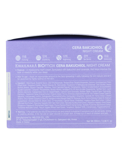 Изг-ль: Welcos Co., LTD., КОРЕЯ, РЕСПУБЛИКА, 21-12, Toegyegongdan 1-gil, Chuncheon-si, Gangwon-do. Ночной крем для лица с керамидами и экстрактом бакучиоли. Kwailnara Biomax Cera Bakuchiol Night Cream. Ночной крем улучшает эластичность кожи. Содержание бакучиола, хорошая альтернатива ретинолу, средство на растительной основе, заметно подтягивает кожу лица и разглаживает морщинки без раздражения. Керамиды глубоко питают и увлажняют сухую кожу лица в течение ночи. Способ применения: нанести необходимое количество крема на предварительно очищенную, тонизированную кожу.