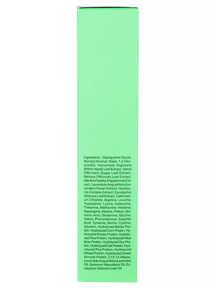 Dipropylene Glycol, Myristyl Alcohol, Water, 1,2-Hexanediol, "Hamamelis Virginiana (Witch Hazel), Leaf Extract", Salvia Officinalis (Sage) Leaf Extract, Melissa Officinalis Leaf Extract, Mentha Piperita (Peppermint) Extract, "Lavandula Angustifolia (Lavender), Flower Extract", Houttuynia Cordata Extract, Eucalyptus Globulus Leaf Extract, Cetrimonium Chloride, Arginine, Leucine, Tryptophan, Lysine, Isoleucine, Threonine, Methionine, Histidine, Asparagine, Alanine, Proline, Glutamic Acid, Glutamine, Glycine, Valine, Phenylalanine, Aspartic Acid, Tyrosine, Serine, Cystine, Glycerin, Hydrolyzed Barley Protein, Hydrolyzed Corn Protein, Hydrolyzed Potato Protein, Hydrolyzed Rice Protein, Hydrolyzed Rice Bran Protein, Hydrolyzed Soy Protein, Hydrolyzed Oat Protein, Hydrolyzed Pea Protein, Hydrolyzed Wheat Protein, Hydrolyzed Sweet Almond Protein, C13-15 Alkane, Lavandula Angustifolia (Lavender) Oil, Geranium Maculatum Oil, Eucalyptus Globulus Leaf Oil