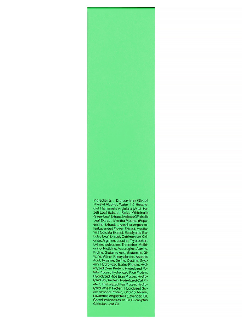 Dipropylene Glycol, Myristyl Alcohol, Water, 1,2-Hexanediol, "Hamamelis Virginiana (Witch Hazel), Leaf Extract", Salvia Officinalis (Sage) Leaf Extract, Melissa Officinalis Leaf Extract, Mentha Piperita (Peppermint) Extract, "Lavandula Angustifolia (Lavender), Flower Extract", Houttuynia Cordata Extract, Eucalyptus Globulus Leaf Extract, Cetrimonium Chloride, Arginine, Leucine, Tryptophan, Lysine, Isoleucine, Threonine, Methionine, Histidine, Asparagine, Alanine, Proline, Glutamic Acid, Glutamine, Glycine, Valine, Phenylalanine, Aspartic Acid, Tyrosine, Serine, Cystine, Glycerin, Hydrolyzed Barley Protein, Hydrolyzed Corn Protein, Hydrolyzed Potato Protein, Hydrolyzed Rice Protein, Hydrolyzed Rice Bran Protein, Hydrolyzed Soy Protein, Hydrolyzed Oat Protein, Hydrolyzed Pea Protein, Hydrolyzed Wheat Protein, Hydrolyzed Sweet Almond Protein, C13-15 Alkane, Lavandula Angustifolia (Lavender) Oil, Geranium Maculatum Oil, Eucalyptus Globulus Leaf Oil