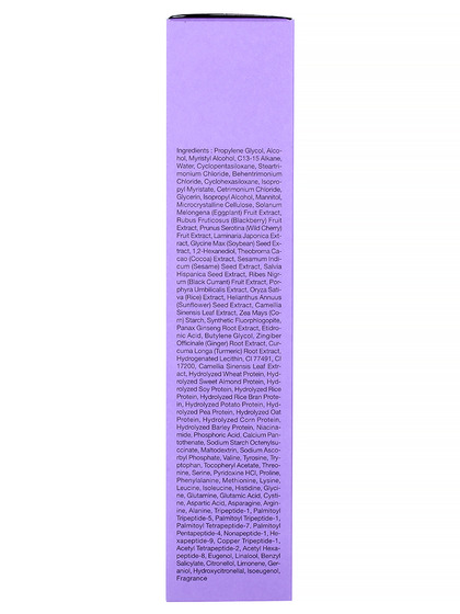 Propylene Glycol, Alcohol, Water, Myristyl Alcohol, C13-15 Alkane, Cyclopentasiloxane, Cyclohexasiloxane, Steartrimonium Chloride, Cetrimonium Chloride, Behentrimonium Chloride, Isopropyl Alcohol, Isopropyl Myristate, "Solanum Melongena (Eggplant) Fruit, Extract", Laminaria Japonica Extract, "Rubus Fruticosus (Blackberry) Fruit, Extract", "Prunus Serotina (Wild Cherry) Fruit, Extract", "Ribes Nigrum (Black Currant) Fruit, Extract", "Sesamum Indicum (Sesame) Seed, Extract", Oryza Sativa (Rice) Extract, Salvia Hispanica Seed Extract, "Helianthus Annuus (Sunflower) Seed, Extract", Theobroma Cacao (Cocoa) Extract, Glycine Max (Soybean) Seed Extract, Porphyra Umbilicalis Extract, Camellia Sinensis Leaf Extract, 1,2-Hexanediol, Hexapeptide-9, Palmitoyl Pentapeptide-4, Palmitoyl Tripeptide-5, Palmitoyl Tripeptide-1, Palmitoyl Tetrapeptide-7, Tripeptide-1, Copper Tripeptide-1, Acetyl Hexapeptide-8, Acetyl Tetrapeptide-2, Nonapeptide-1, Glycerin, Arginine, Leucine, Tryptophan, Lysine, Isoleucine, Threonine, Methionine, Histidine, Asparagine, Alanine, Proline, Glutamic Acid, Glutamine, Glycine, Valine, Phenylalanine, Aspartic Acid, Tyrosine, Serine, Cystine, Hydrolyzed Barley Protein, Hydrolyzed Corn Protein, Hydrolyzed Potato Protein, Hydrolyzed Rice Protein, Hydrolyzed Rice Bran Protein, Hydrolyzed Soy Protein, Hydrolyzed Oat Protein, Hydrolyzed Pea Protein, Hydrolyzed Wheat Protein, Hydrolyzed Sweet Almond Protein, "Zingiber Officinale (Ginger) Root, Extract", "Curcuma Longa (Turmeric) Root, Extract", Butylene Glycol, Panax Ginseng Root Extract, Mannitol, Microcrystalline Cellulose, Zea Mays (Corn) Starch, Synthetic Fluorphlogopite, CI 77491, Hydrogenated Lecithin, Niacinamide, Calcium Pantothenate, Maltodextrin, Sodium Starch Octenylsuccinate, Sodium Ascorbyl Phosphate, Tocopheryl Acetate, Pyridoxine HCl, Etidronic Acid, Phosphoric Acid, Fragrance (Eugenol, Linalool), "Fragrance (Benzyl Salicylate, Citronellol, Limonene, Eugenol, Geraniol, Hydroxycitronellal,, Isoeugenol, Linalool)