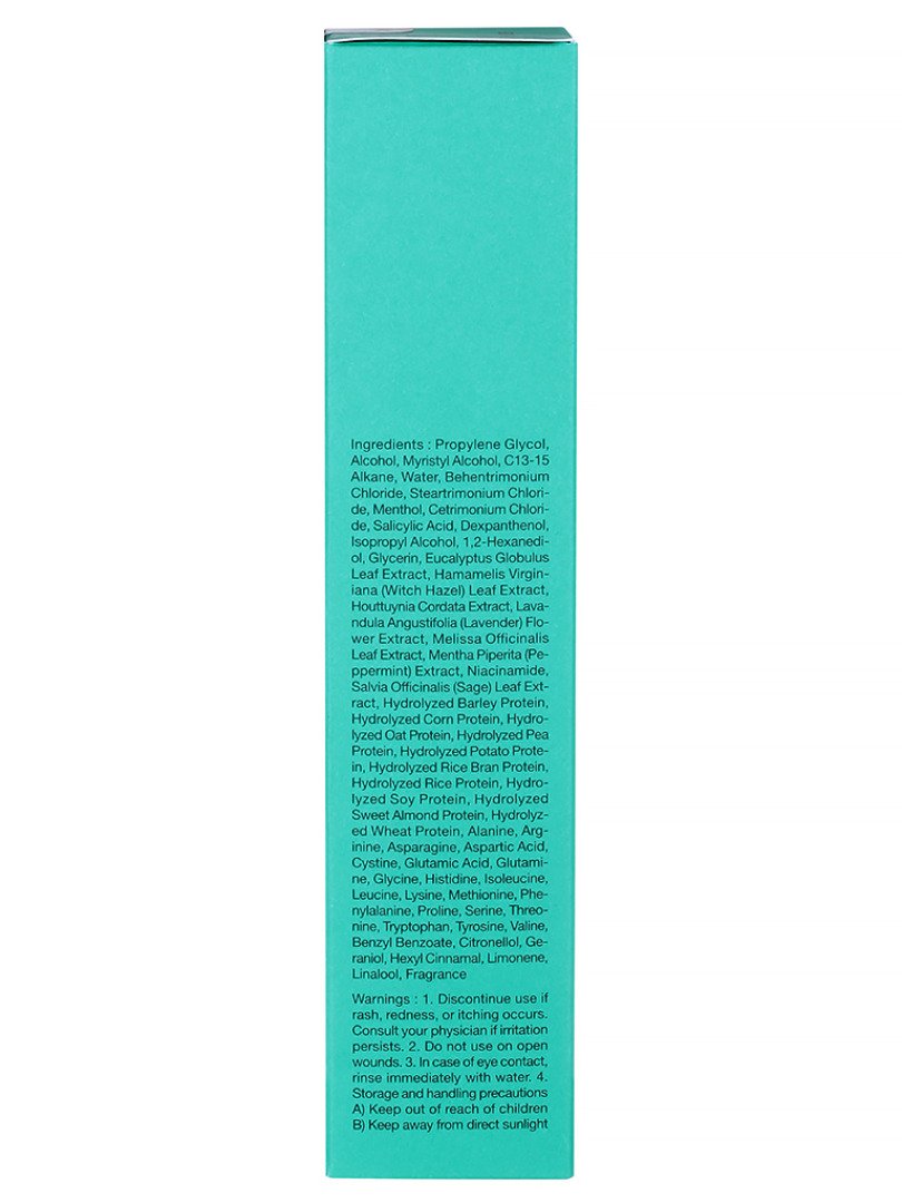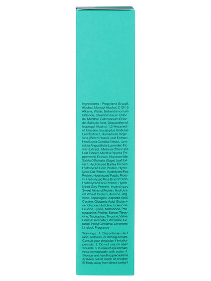 Propylene Glycol, Alcohol, Water, Myristyl Alcohol, C13-15 Alkane, Cetrimonium Chloride, Steartrimonium Chloride, Behentrimonium Chloride, Isopropyl Alcohol, 1,2-Hexanediol, "Hamamelis Virginiana (Witch Hazel), Leaf Extract", Salvia Officinalis (Sage) Leaf Extract, Melissa Officinalis Leaf Extract, Mentha Piperita (Peppermint) Extract, "Lavandula Angustifolia (Lavender), Flower Extract", Houttuynia Cordata Extract, Eucalyptus Globulus Leaf Extract, Glycerin, Hydrolyzed Barley Protein, Hydrolyzed Corn Protein, Hydrolyzed Potato Protein, Hydrolyzed Rice Protein, Hydrolyzed Rice Bran Protein, Hydrolyzed Soy Protein, Hydrolyzed Oat Protein, Hydrolyzed Pea Protein, Hydrolyzed Wheat Protein, Hydrolyzed Sweet Almond Protein, Arginine, Leucine, Tryptophan, Lysine, Isoleucine, Threonine, Methionine, Histidine, Asparagine, Alanine, Proline, Glutamic Acid, Glutamine, Glycine, Valine, Phenylalanine, Aspartic Acid, Tyrosine, Serine, Cystine, Menthol, Salicylic Acid, Dexpanthenol, Niacinamide, "Fragrance (Benzyl Benzoate, Citronellol, Geraniol, Hexyl, Cinnamal,Limonene, Linalool)