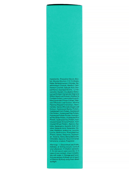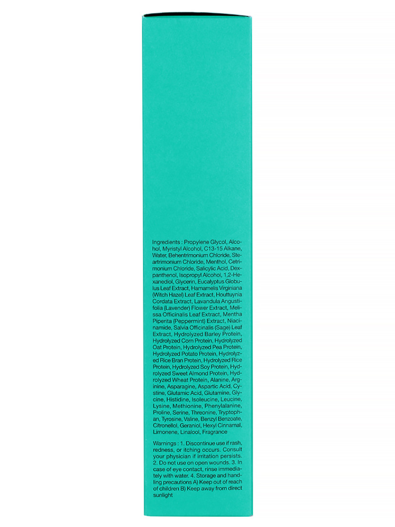 Propylene Glycol, Alcohol, Water, Myristyl Alcohol, C13-15 Alkane, Cetrimonium Chloride, Steartrimonium Chloride, Behentrimonium Chloride, Isopropyl Alcohol, 1,2-Hexanediol, "Hamamelis Virginiana (Witch Hazel), Leaf Extract", Salvia Officinalis (Sage) Leaf Extract, Melissa Officinalis Leaf Extract, Mentha Piperita (Peppermint) Extract, "Lavandula Angustifolia (Lavender), Flower Extract", Houttuynia Cordata Extract, Eucalyptus Globulus Leaf Extract, Glycerin, Hydrolyzed Barley Protein, Hydrolyzed Corn Protein, Hydrolyzed Potato Protein, Hydrolyzed Rice Protein, Hydrolyzed Rice Bran Protein, Hydrolyzed Soy Protein, Hydrolyzed Oat Protein, Hydrolyzed Pea Protein, Hydrolyzed Wheat Protein, Hydrolyzed Sweet Almond Protein, Arginine, Leucine, Tryptophan, Lysine, Isoleucine, Threonine, Methionine, Histidine, Asparagine, Alanine, Proline, Glutamic Acid, Glutamine, Glycine, Valine, Phenylalanine, Aspartic Acid, Tyrosine, Serine, Cystine, Menthol, Salicylic Acid, Dexpanthenol, Niacinamide, "Fragrance (Benzyl Benzoate, Citronellol, Geraniol, Hexyl, Cinnamal,Limonene, Linalool)