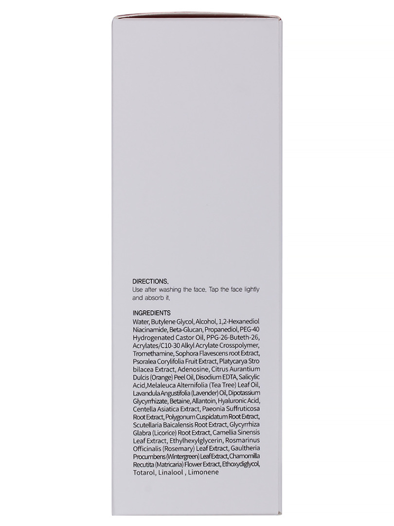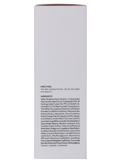 Water, Butylene Glycol, Alcohol, 1,2-Hexanediol, Niacinamide, Beta-Glucan, Propanediol, PEG-40 Hydrogenated Castor Oil, PPG-26-Buteth-26, Acrylates/C10-30 Alkyl Acrylate Crosspolymer, Tromethamine, Sophora Flavescens Root Extract, Psoralea Corylifolia Fruit Extract, Platycarya Strobilacea Extract, Adenosine, Citrus Aurantium Dulcis (Orange) Peel Oil, Disodium EDTA, Salicylic Acid, Melaleuca Alternifolia (Tea Tree) Leaf Oil, Dipotassium Glycyrrhizate, Lavandula Angustifolia (Lavender) Oil, Betaine, Allantoin, Hyaluronic Acid, Centella Asiatica Extract, Paeonia Suffruticosa Root Extract, Polygonum Cuspidatum Root Extract, Scutellaria Baicalensis Root Extract, Glycyrrhiza Glabra (Licorice) Root Extract, Camellia Sinensis Leaf Extract, Ethylhexylglycerin, Rosmarinus Officinalis (Rosemary) Leaf Extract, Gaultheria Procumbens (Wintergreen) Leaf Extract, Chamomilla Recutita (Matricaria) Flower Extract, Ethoxydiglycol, Totarol
