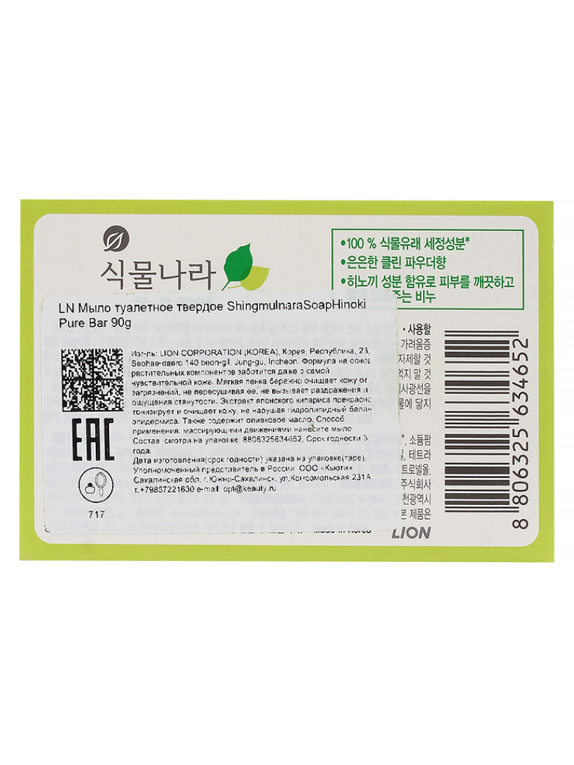 Изг-ль: LION CORPORATION (KOREA), Корея, Республика, 23, Seohae-daero 140 beon-gil, Jung-gu, Incheon. Формула на основе растительных компонентов заботится даже о самой чувствительной коже. Мягкая пенка бережно очищает кожу от загрязнений, не пересушивая ее, не вызывает раздражения и ощущения стянутости. Экстракт японского кипариса прекрасно тонизирует и очищает кожу, не нарушая гидролипидный баланс эпидермиса. Также содержит оливковое масло. Способ применения: массирующими движениями нанесите мыло на кожу, после чего тщательно смойте обильным количеством воды.