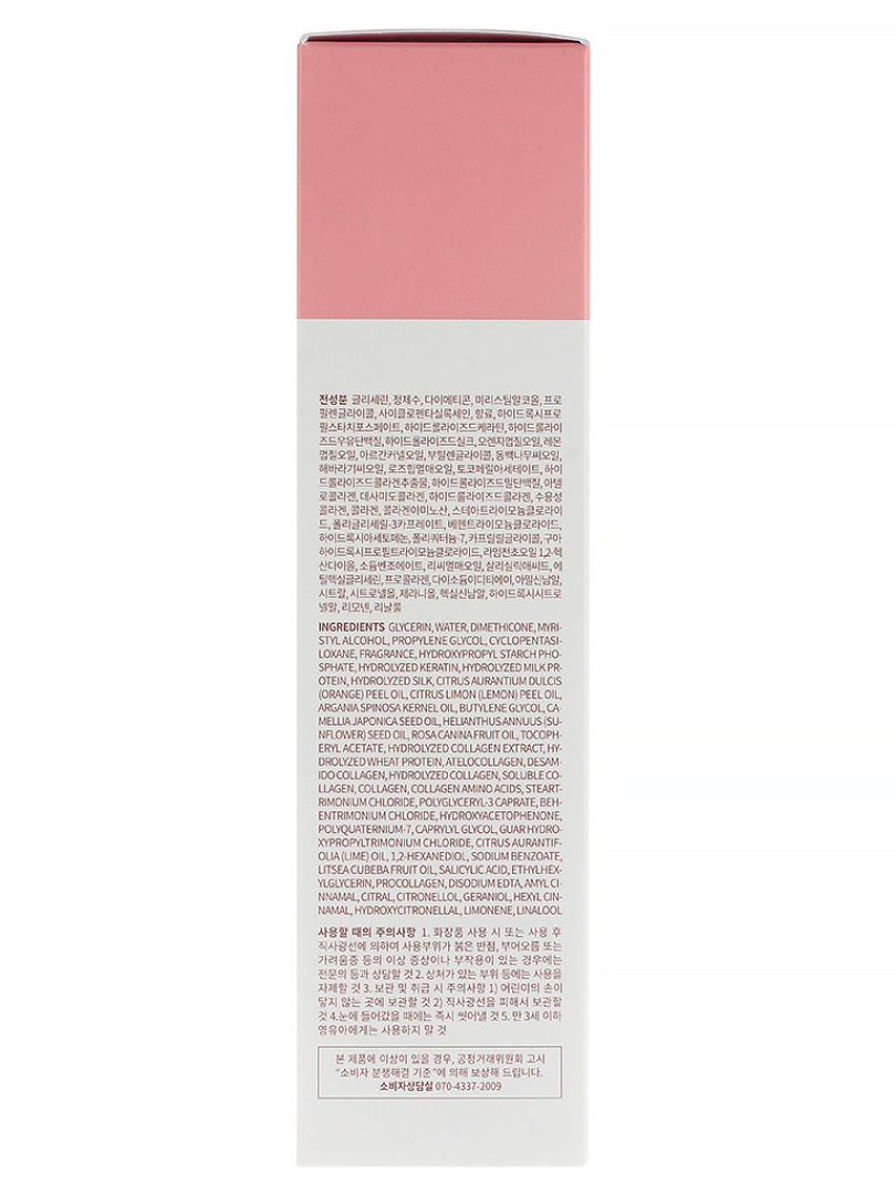 Glycerin, Water, Dimethicone, Myristyl Alcohol, Propylene Glycol, Cyclopentasiloxane, Fragrance, Hydroxypropyl Starch Phosphate, Steartrimonium Chloride, Polyglyceryl-3 Caprate, Behentrimonium Chloride, Hydroxyacetophenone, Linalool, Polyquaternium-7, Caprylyl Glycol, Hexyl Cinnamal, Limonene, Guar Hydroxypropyltrimonium Chloride, Amyl Cinnamal, Argania Spinosa Kernel Oil, Butylene Glycol, Camellia Japonica Seed Oil, Helianthus Annuus (Sunflower) Seed Oil, Rosa Canina Fruit Oil, Tocopheryl Acetate, Geraniol, Hydroxycitronellal, Disodium Edta, Hydrolyzed Keratin, Hydrolyzed Milk Protein, Hydrolyzed Silk, 1,2-Hexanediol, Sodium Benzoate, Citral, Salicylic Acid, Hydrolyzed Wheat Protein, Citronellol, Atelocollagen, Desamido Collagen, Hydrolyzed Collagen, Soluble Collagen, Collagen, Collagen Amino Acids, Ethylhexylglycerin, Procollagen